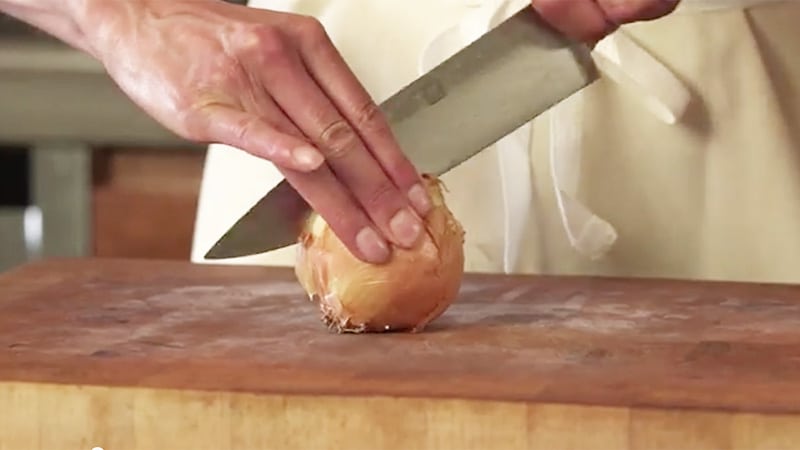 Coloque os dedos em forma de garra e apoie-os na cebola, mantendo as unhas mais afastadas da faca. Terão de ser os nós dos dedos a estar em contacto com a faca, não as pontas dos dedos. A seguir, corte a cebola transversalmente com um movimento rápido de cima para baixo.